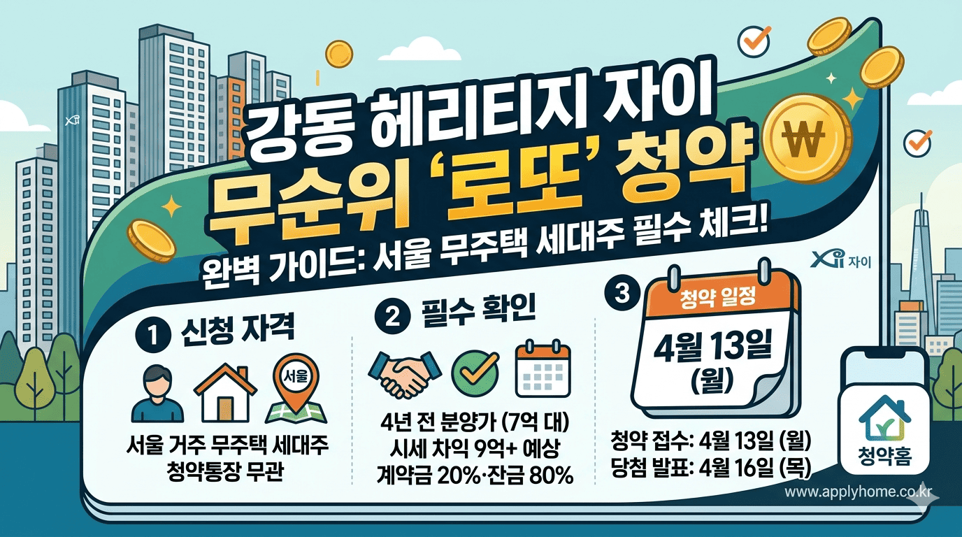 강동 헤리티지 자이 무순위 청약은 서울 거주 무주택자에게는 내 집 마련과 자산 증식을 동시에 이룰 수 있는 최고의 기회입니다. 하지만 까다로운 자격 조건과 실거주 의무 등 체크해야 할 점도 명확합니다. 4월 13일, 꼼꼼한 준비를 통해 ‘9억 로또’의 주인공이 되어보시길 바랍니다.